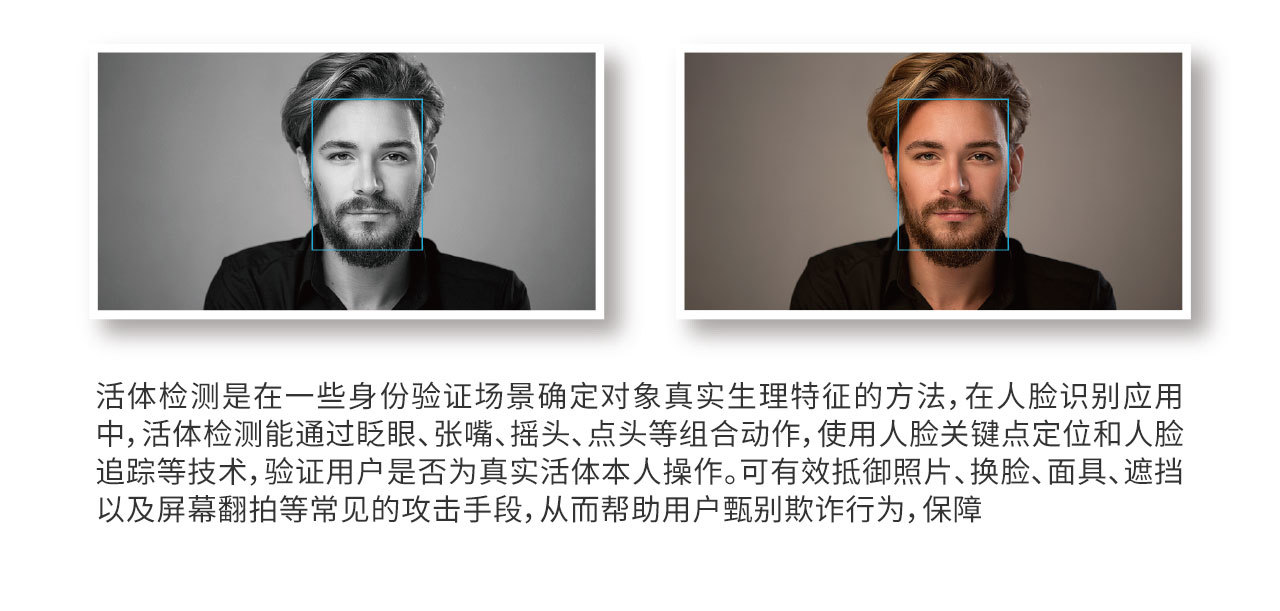 • 靜(jìng)默活體(tǐ)檢測則通(tōng)過用(yòng)戶在攝像頭範圍內(nèi)随意停留幾秒(miǎo)後的(de)抓拍(pāi)來(lái)判斷是(shì)否為(wèi×)真人(rén)。