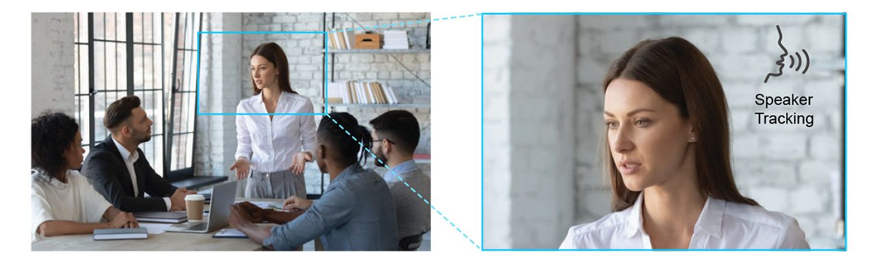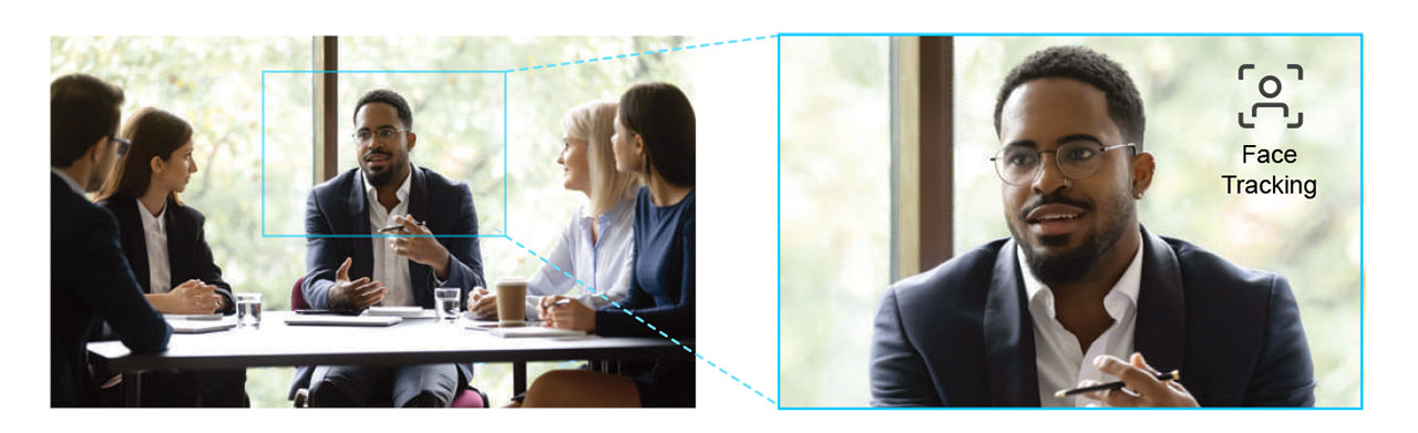 自(zì)動取景可(kě)識别與會(huì)者的(de)數(shù)量和(hé)位置,根據與會(huì)者的(de)數(shù)量和(hé)位置自(zì)動調整以獲☆得(de)最佳角度,從(cóng)而提供特寫視(shì)圖。