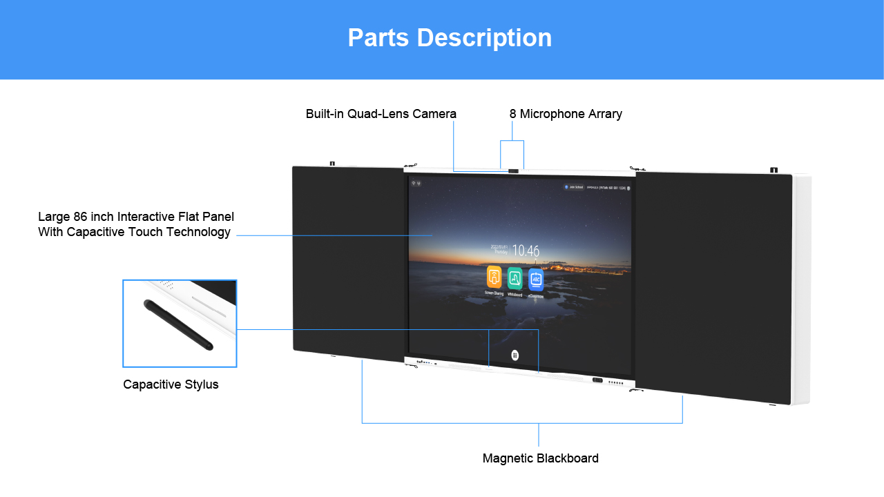 FD86-H6Q528 是(shì)一(yī)款專為(wèi)教育場(chǎng)景設計(jì)的(de)智能(néng)黑(hēi)"闆,将 86 英寸交互式平闆與雙面黑(hēi)闆翼無縫集成,結合傳統書(shū)寫與數(shù)字互動,滿足多(duō)樣化(huà)教學需求。雙開(kāi)合黑(hēi)闆翼便于教師(s♥hī)書(shū)寫講解、展示闆書(shū)內(nèi)容或學生(shēng)作(zuò)品,營造更具參與感的(de)教學氛圍。