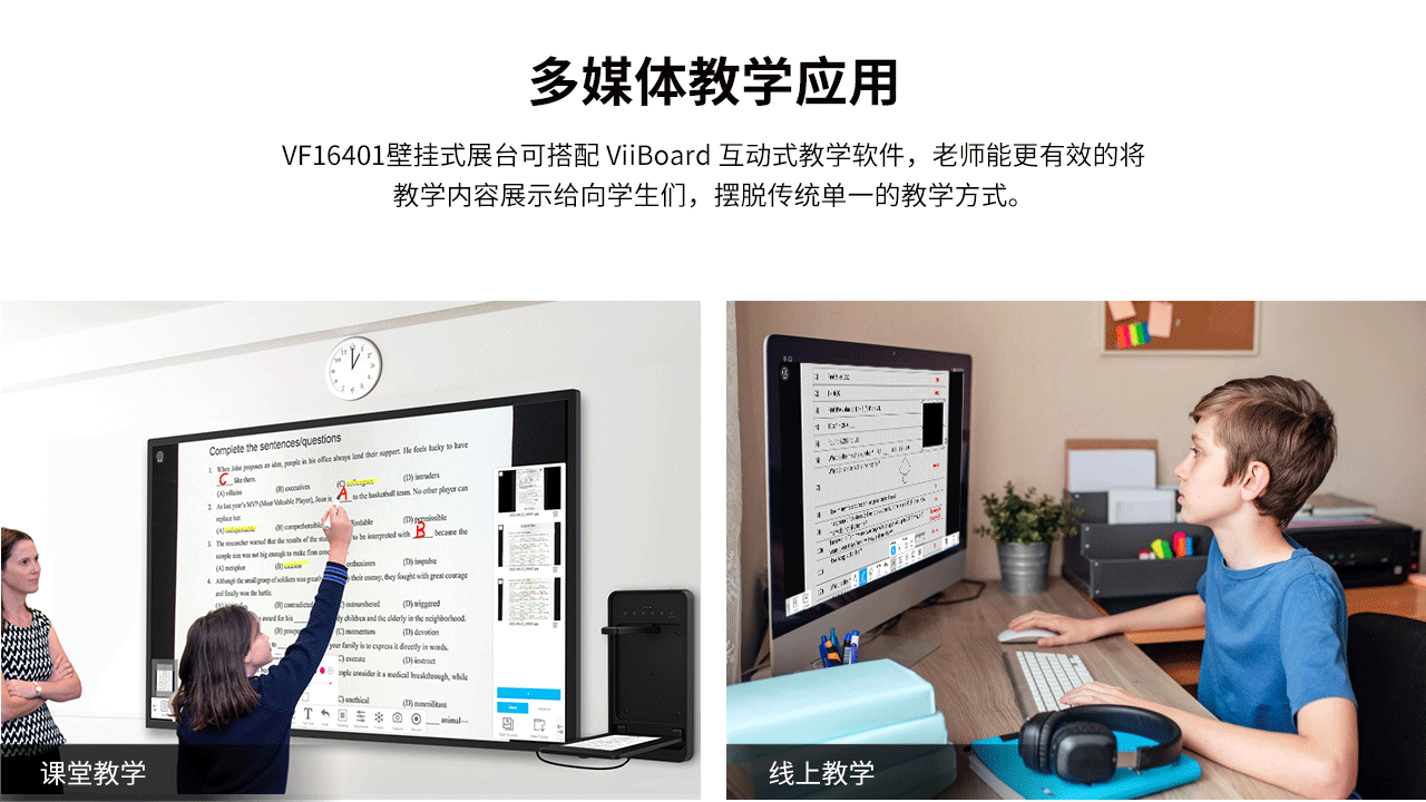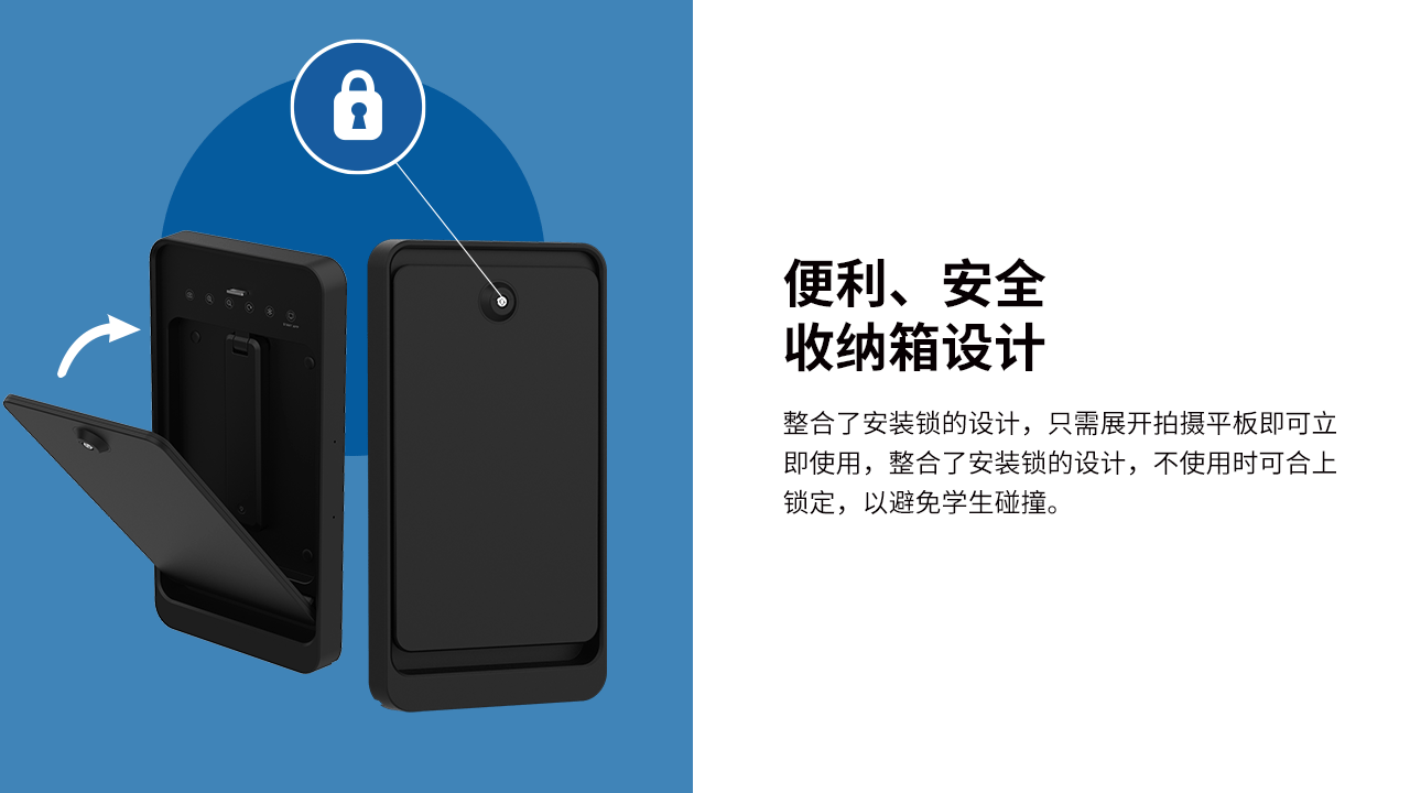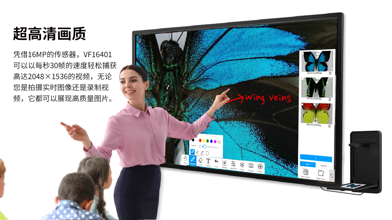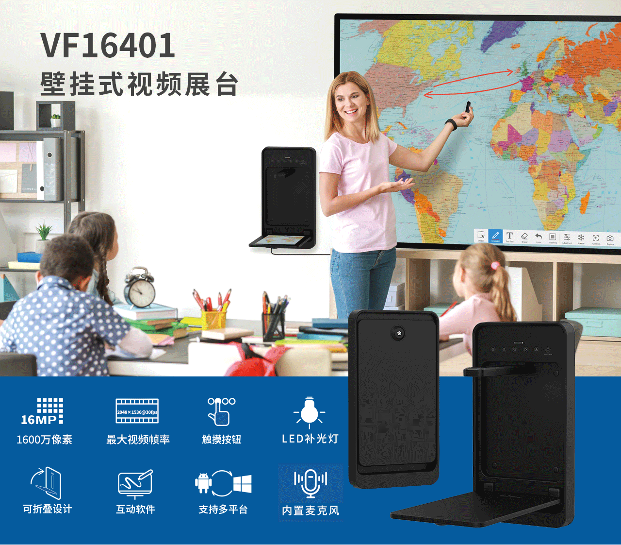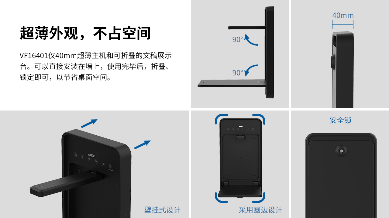 VF16401是(shì)一(yī)款功能(néng)強大(dà)的(de)壁挂式視(shì)頻(pín)展台,專門(mén)為(wèi)課堂使用(yòng)而設計(jì)。該視(shì)頻(÷pín)展台可(kě)以固定在牆上(shàng),以節省桌面空(kōng)間(jiān),并具有(yǒu)可(kě)折疊的(de)文(wén)稿展示台, 用(yòng)于顯示書(shū)籍、文(wén)檔和(hé)3D對(duì)象。使用(yòng)完畢後,隻需折疊£并鎖定即可(kě)增加安全性。