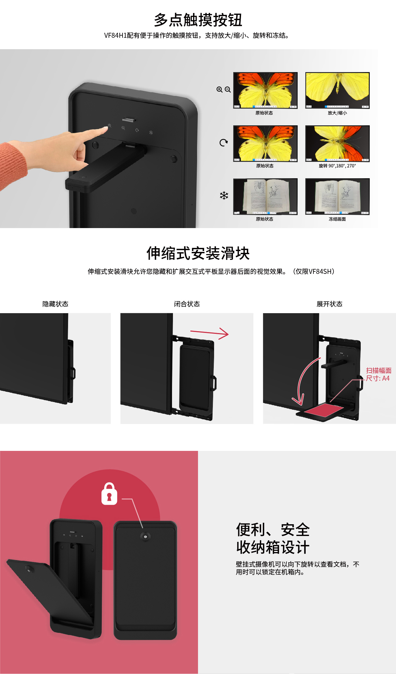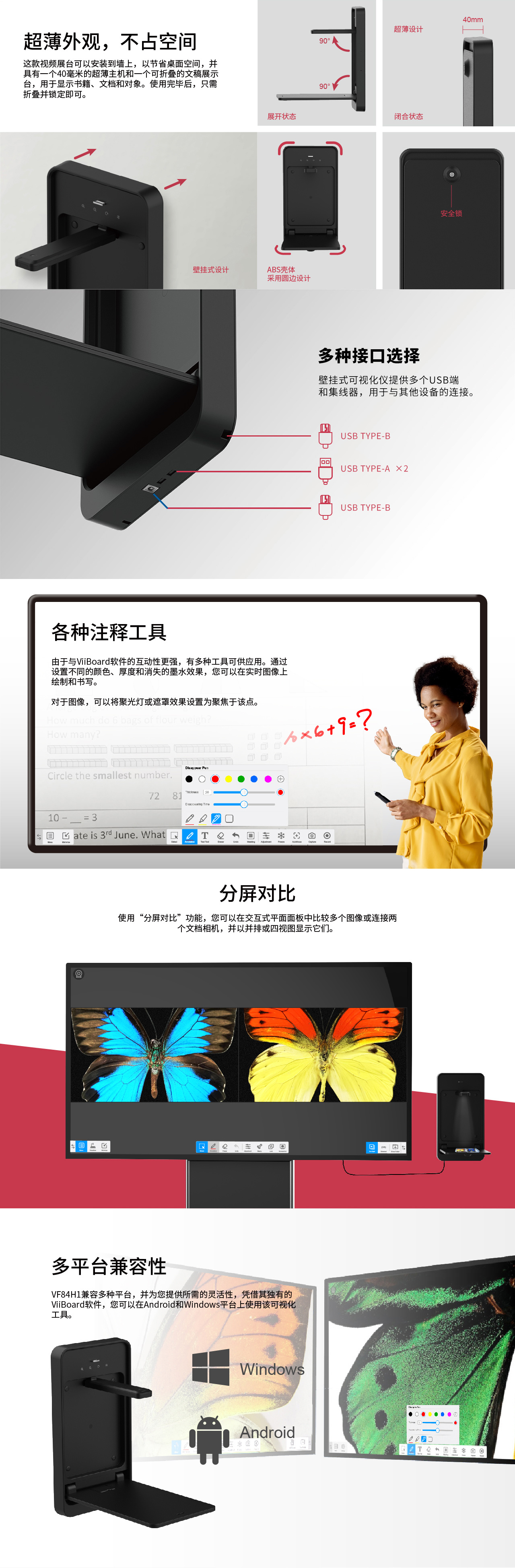 VF84H1是(shì)一(yī)款功能(néng)強大(dà)的(de)壁挂式視(shì)頻(pín)展台,專門(mén)為(wèi)課®堂使用(yòng)而設計(jì)。該視(shì)頻(pín)展台可(kě)以固定在牆上(shàng),以節省桌面空(kōng)間(jiān),并具有(yǒu)可(kě)α折疊的(de)文(wén)稿展示台,用(yòng)于顯示書(shū)籍、文(wén)檔和(hé)3D對(duì)象。使用(yòng)完畢後,隻需折疊并鎖定即可(kě)增加安全性。
