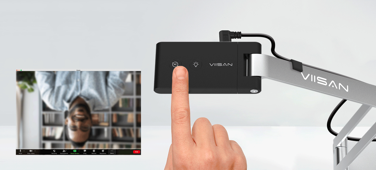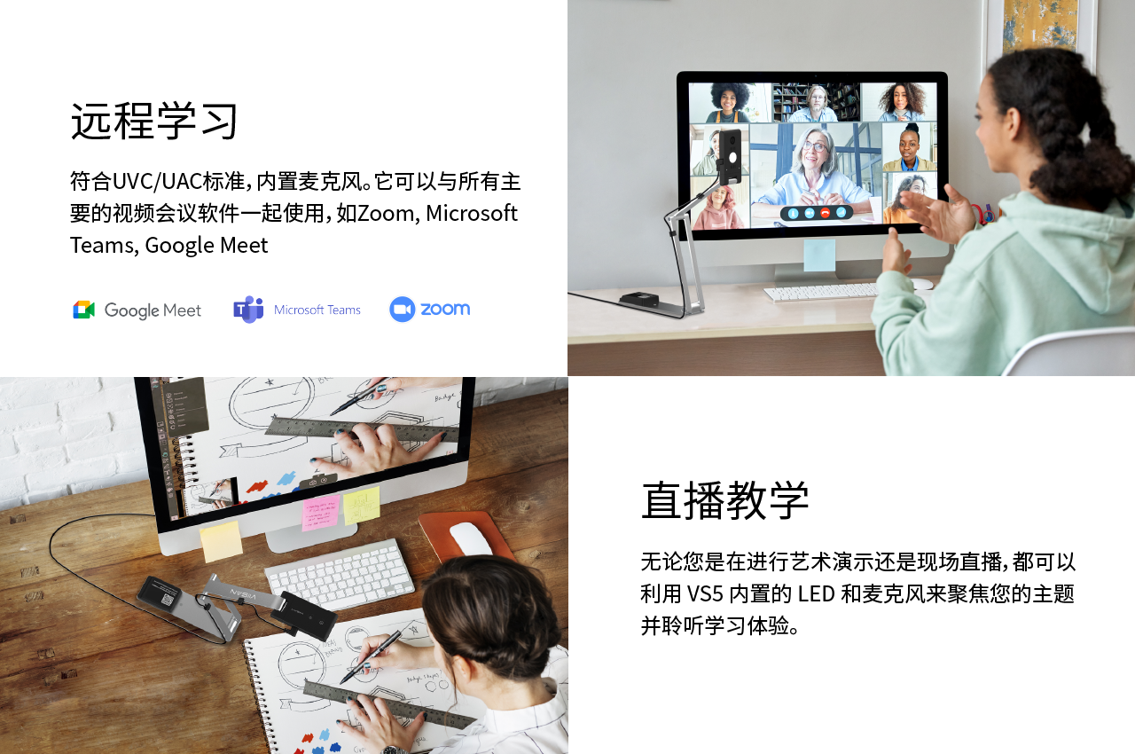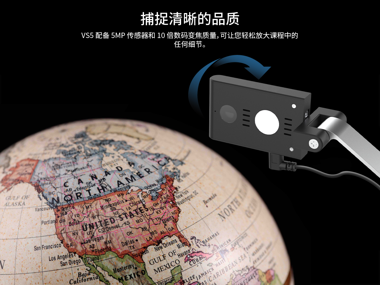 VS5 适用(yòng)于課堂教學和(hé)視(shì)頻(pín)會(huì)議(yì)。隻需單擊一(yī)個(gè)按鈕,™即可(kě)翻轉實時(shí)圖像,并根據需要(yào)對(duì)焦您的(de)臉部、課本以及任何物(wù)體(tǐ)。