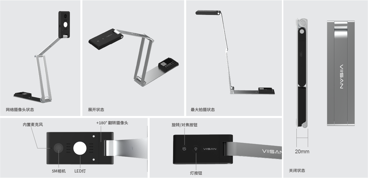 VS5是(shì)一(yī)款2合1 2K便攜式USB展台工(gōng)具(文(wén)檔相(xiàng)機(jī)),用(yòng)于遠(yuǎn₹)程學習(xí)和(hé)現(xiàn)場(chǎng)演示。它提供高(gāo)達2K分(fēn)辨率的(de)清晰圖像和₩(hé)高(gāo)幀率視(shì)頻(pín)流輸出,獨特的(de)多(duō)關節設計(jì)使您可(kě)以輕松擴展高(gāo)度,并将相(xià∞ng)機(jī)頭折疊到(dào)完美(měi)的(de)角度,以查看(kàn)材料的(de)更多(duō)細節。